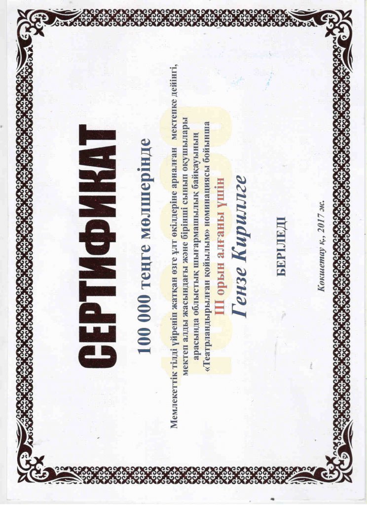 Сегодня 16 июня 2017 года в «Доме дружбы» состоялось награждение призеров областного конкурса знатоков государственного языка среди детей не коренной национальности. Воспитанник группы №9 с государственным языком обучения Гензе Кирил получил Диплом 3 степени. Администрация детского сада поздравляет Кирила в призовым местом. Также поздравляем учителя казахского языка высшей категории Сексембаеву Айгуль Балгужиновну за качественную подготовку к данному конкурсу.